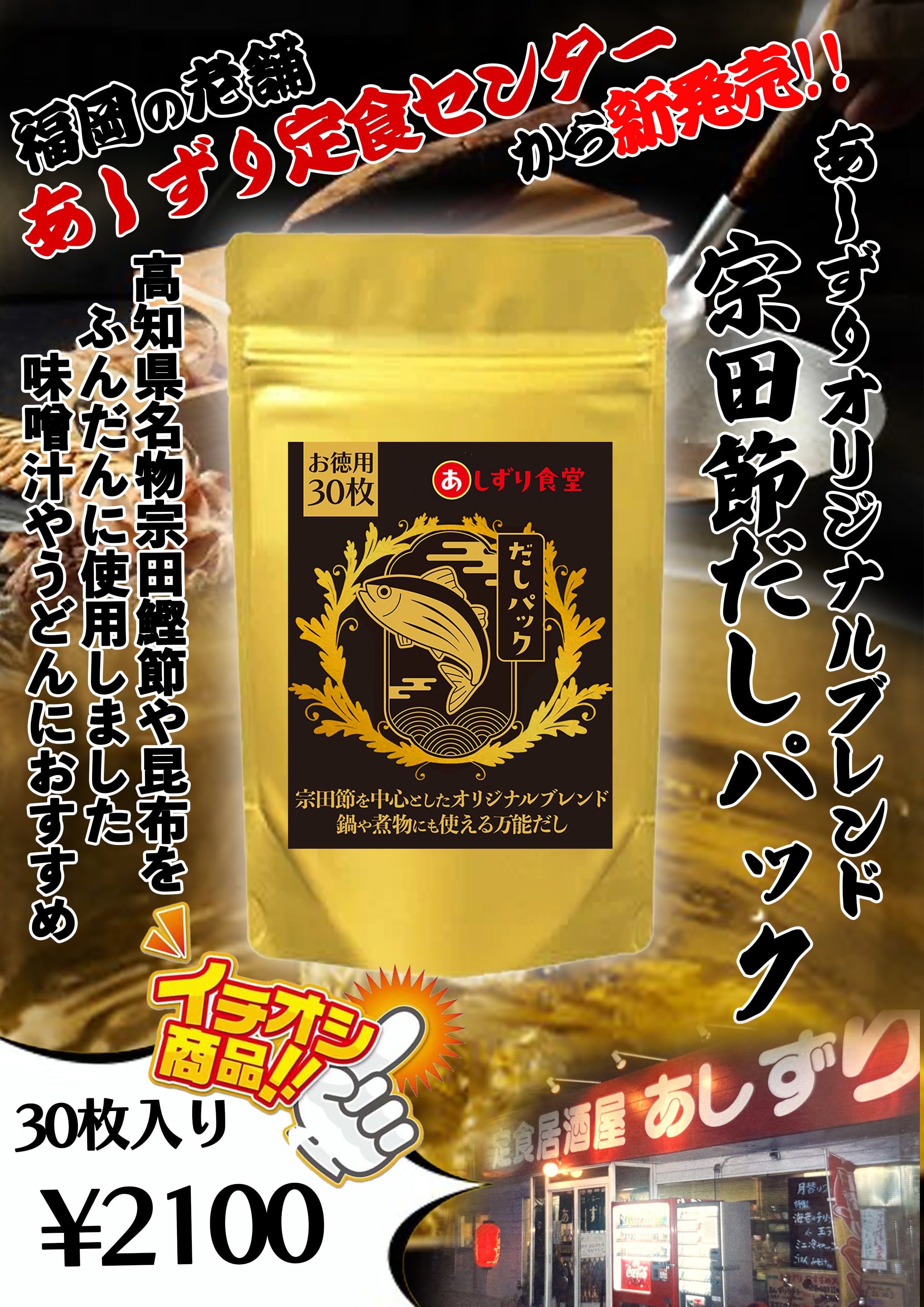 あしずりが自信を持ってお届けするあしずり特製だしパックは、厳選された「宗田節」を使用したオリジナルブレンドのだしです。